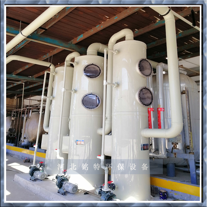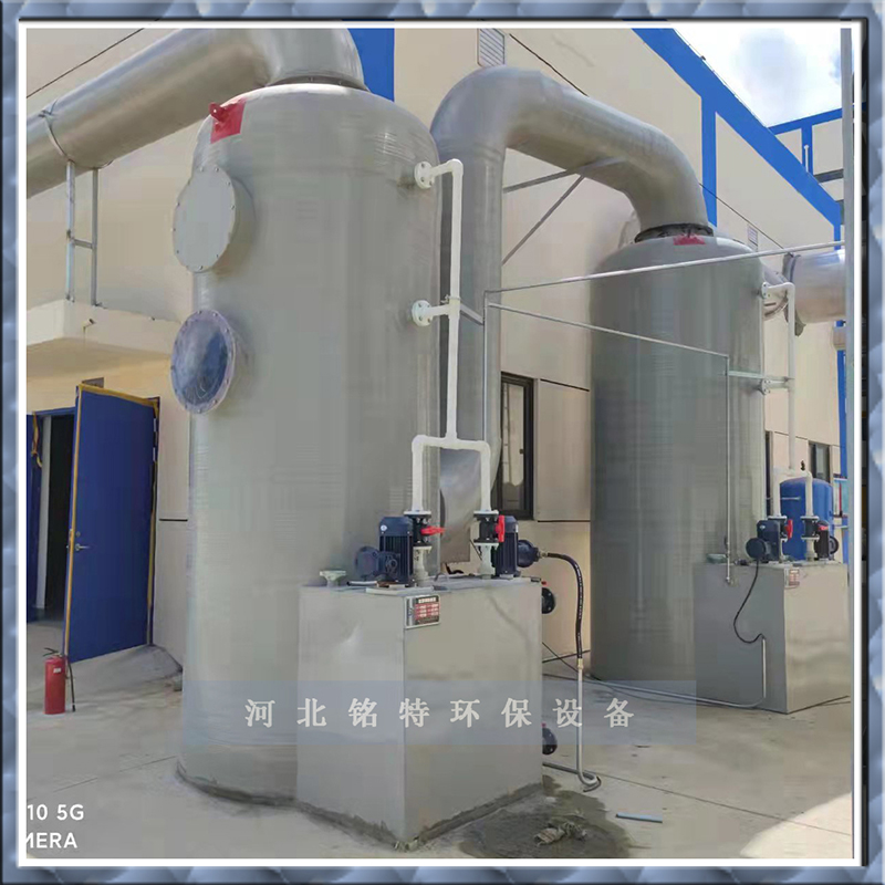 為濕法吸收型淨化設備(bèi),其功能(néng)設計為填料、噴淋分組分級式。當處理廢氣為酸性時,一般宜采用氫氧化鈉(NaOH)為吸收和液。當處理廢氣(qì)為(wéi)堿性時,一般用中性或偏酸性水進行洗滌。其工作原理為:廢氣由風機壓入洗滌塔內外向夾套組成的(de)均壓室,通過勻格柵使廢氣勻速進行一(yī)級填料功能段,進行一級(jí)噴淋(lín),使氣液二相得到一次(cì)充分接觸,經一級處理後(hòu)的廢氣用由(yóu)漸擴段減速進入二級填料噴淋功能段,再使廢氣得到更充分的氣液二相接觸反應,然(rán)後再經脫液器脫液除霧後(hòu),尾氣由排出口(kǒu)經風道排入大氣。